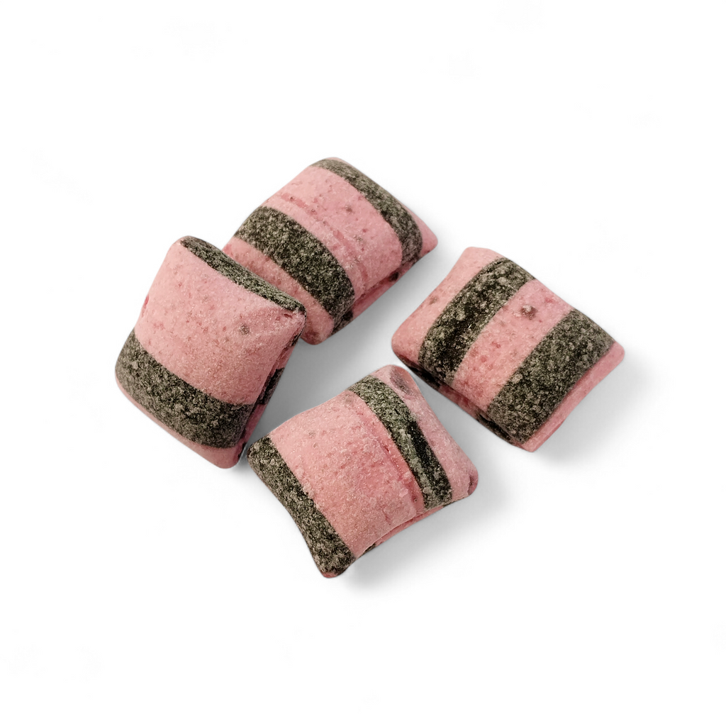 Grenna Hallonsalta Kuddar är klassiska hårda karameller med en tydlig balans mellan söt hallon och lätt sälta. Den krispiga ytan och fylliga smaken gör dem till ett nostalgiskt godis med en unik och omtyckt smakprofil.